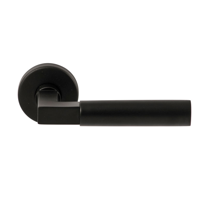 Een twintigtal moderne deurkrukken in RVS met zwarte poedercoating met geveerde rozetten, een prettige prijs en hoogwaardige kwaliteit.