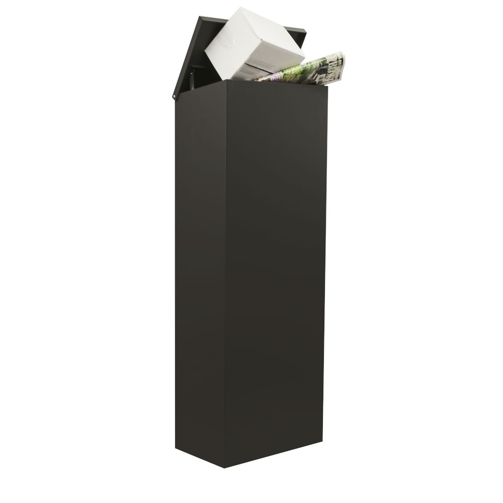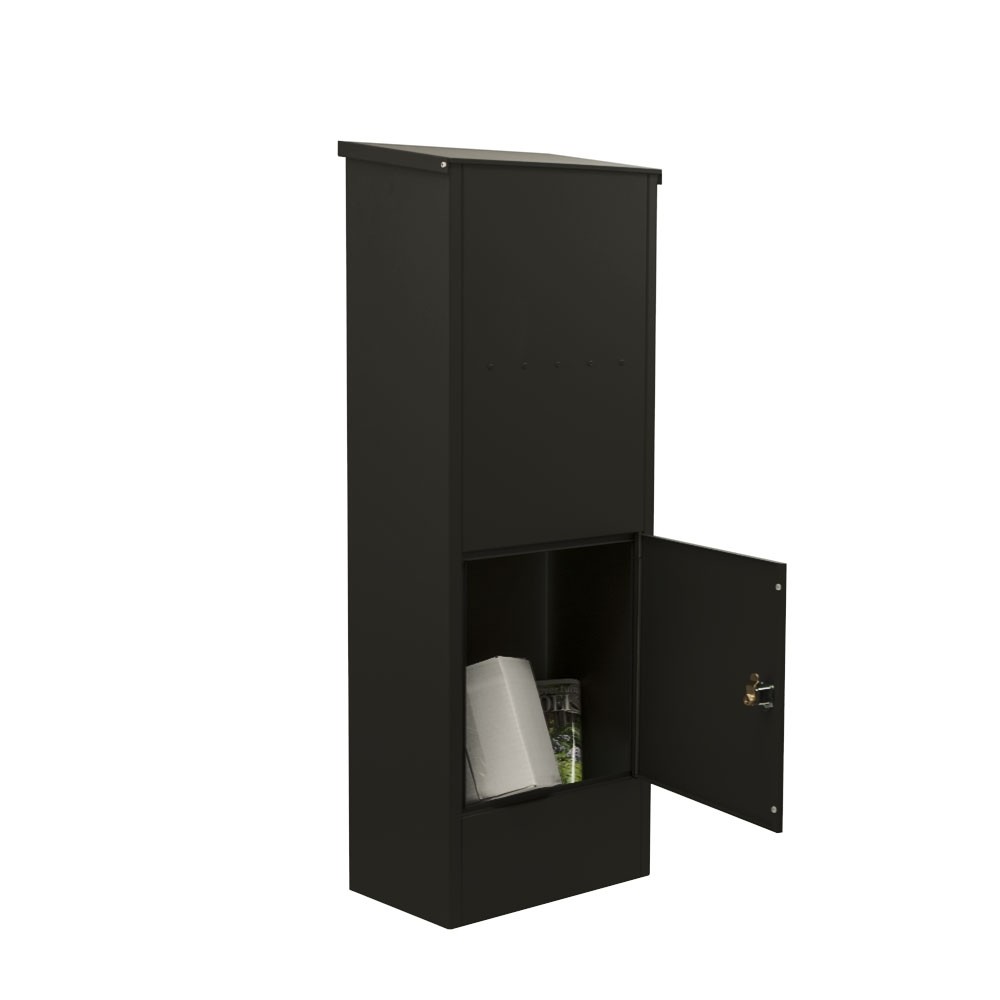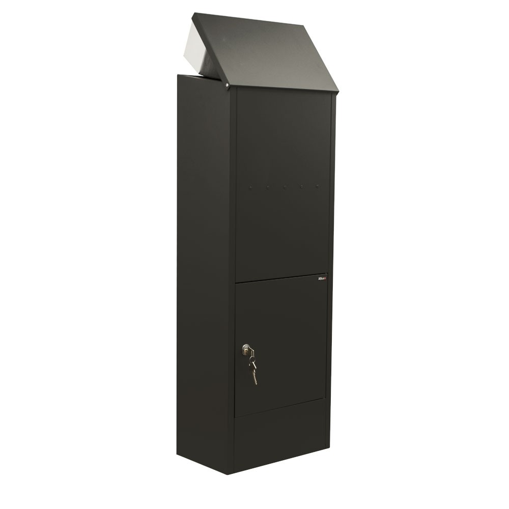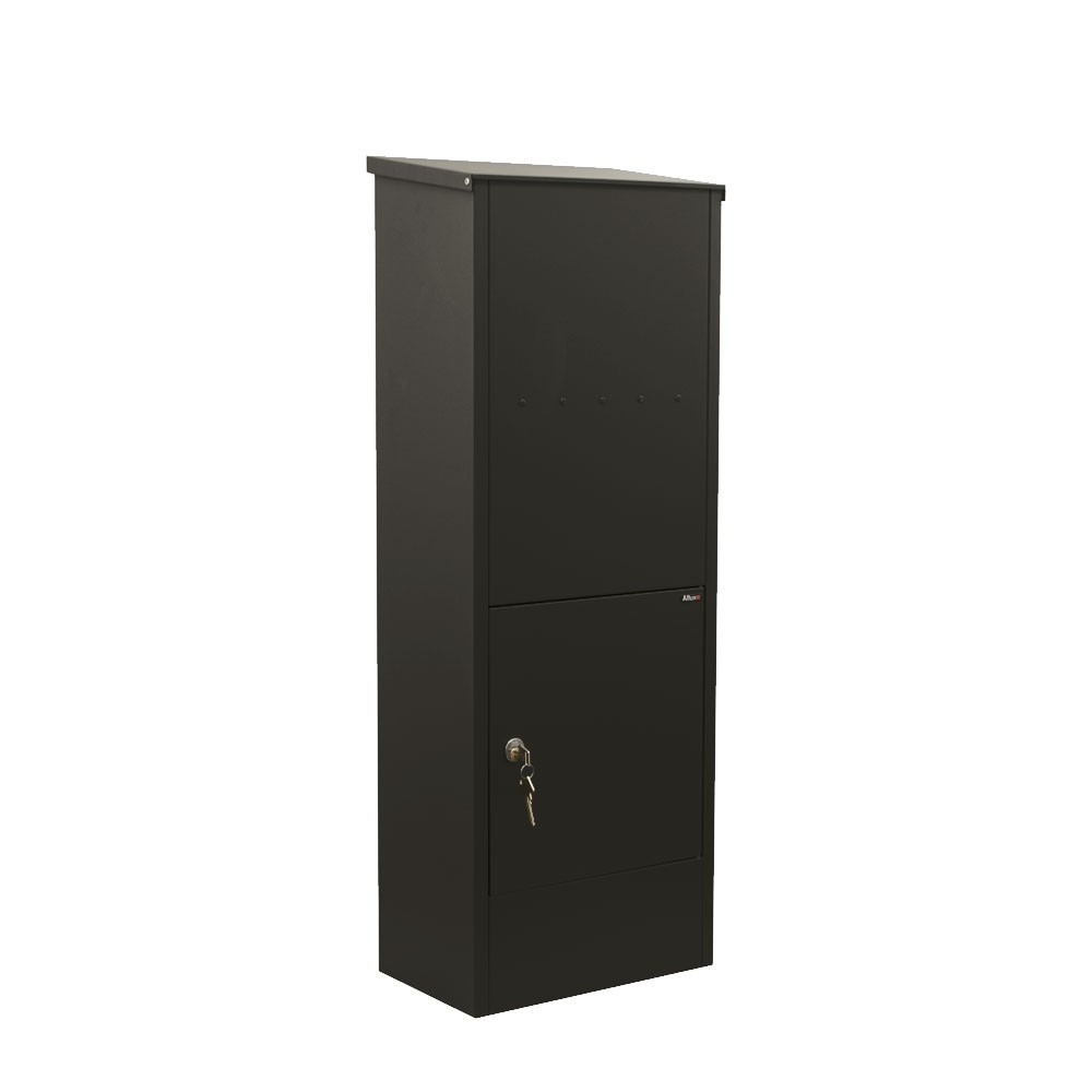 Pakketkast Allux 600 achteruitname zwart is dé oplossing voor het ontvangen van post én pakketjes. Door de grote boveninworp kan het pakketten ontvangen tot een formaat van 100x260x280mm.