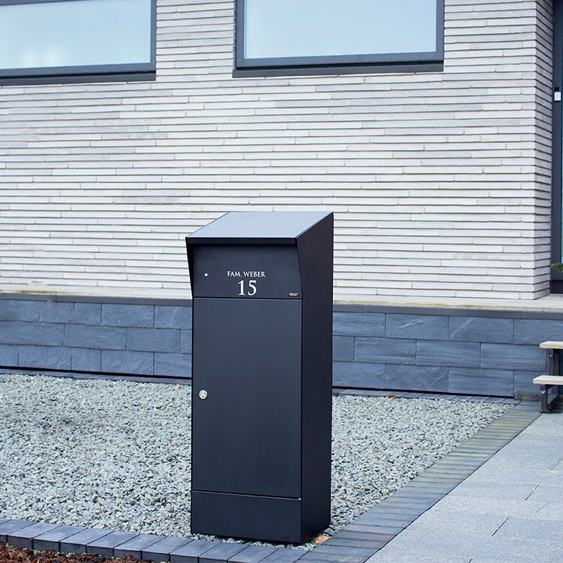 De elegante pakketbrievenbus is gemaakt van gegalvaniseerd staal. Het gegalvaniseerde gedeelte is behandeld met een sterke poedercoating in de kleur zwart (RAL 9011). De postinworp gaat via de bovenzijde, en de uitname via de voorzijde. Deze brievenbus wordt geleverd met een RUKO-slot en 2 sleutels.