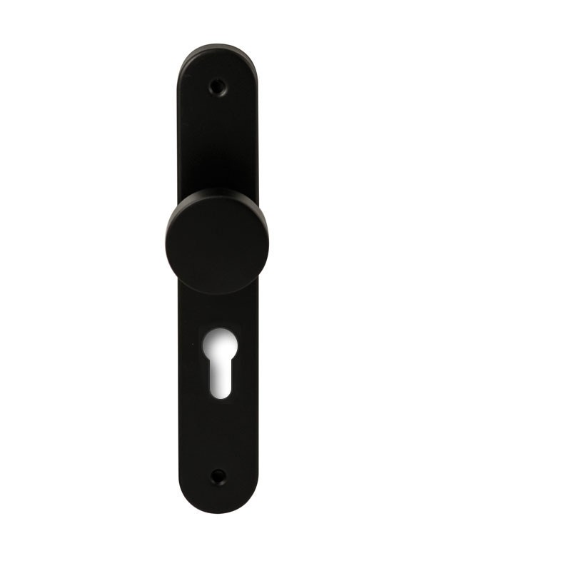 Een twintigtal moderne knopkrukken in RVS met zwarte poedercoating die vastgeveerd op een schild geleverd worden met een prettige prijs en hoogwaardige kwaliteit.