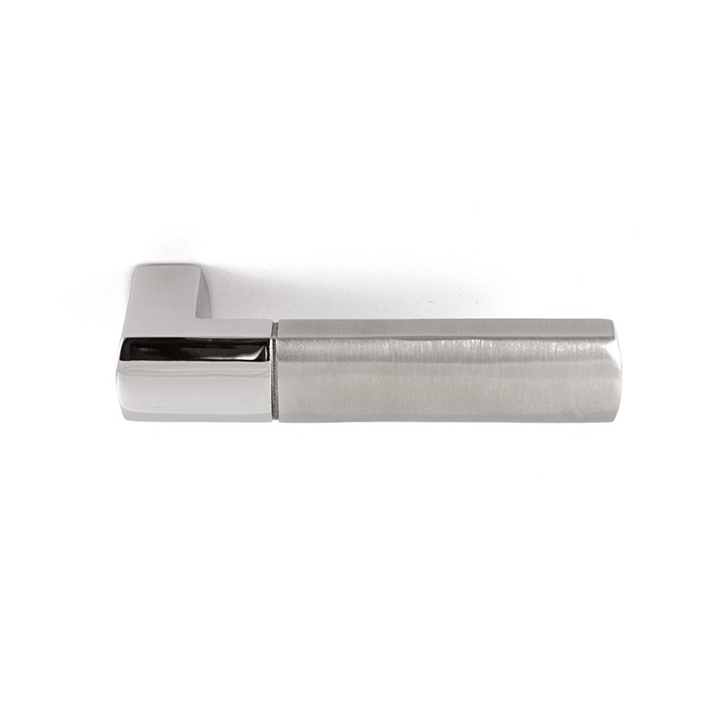 Een afgewerkte deurkruk die met een randje twee delen met elkaar verbind in een mooie robuuste kruk.Dit product is vervaardigd in AISI 304 roestvaststaal. De goede kwaliteit is uitstekend geschikt voor standaard toepassing binnen- en buitenshuis.