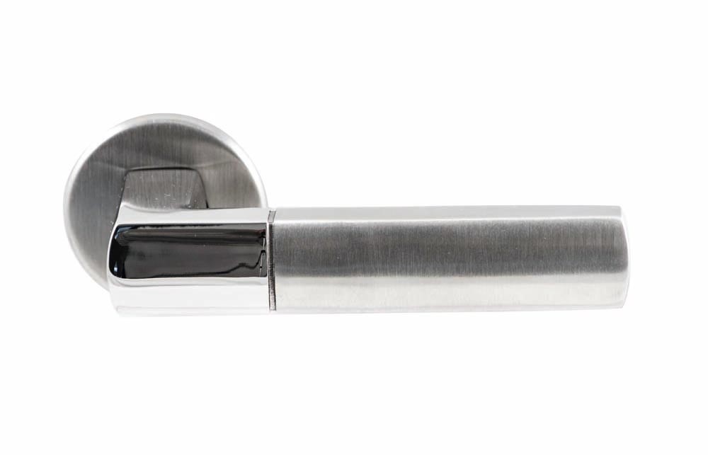 Een in twee finishes afgewerkte deurkruk die glans en mat met elkaar verbind in een mooie robuuste kruk. Deze deurkruk wordt geleverd op dun rond rozet.