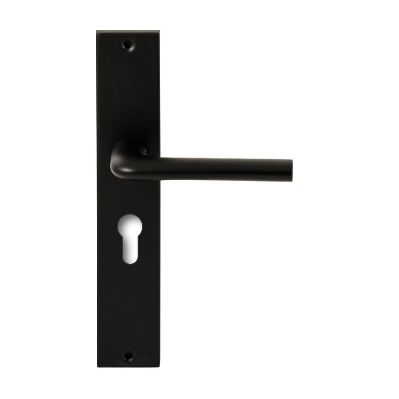 Een twintigtal moderne deurkrukken in RVS met zwarte poedercoating die vastgeveerd op een schild geleverd worden met een prettige prijs en hoogwaardige kwaliteit.