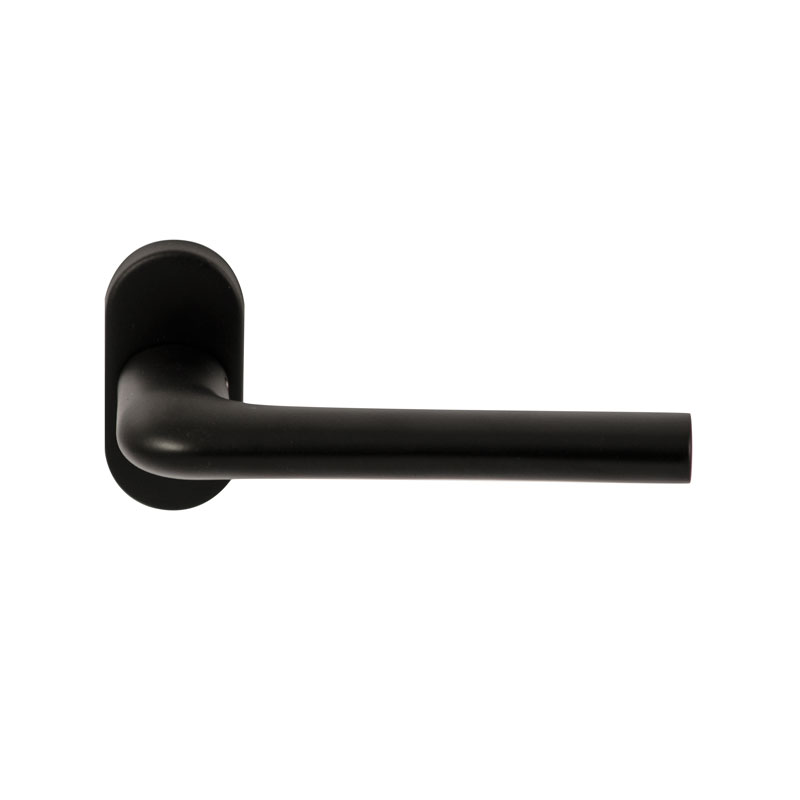 Een twintigtal moderne deurkrukken in RVS met zwarte poedercoating met geveerde rozetten, een prettige prijs en hoogwaardige kwaliteit.
