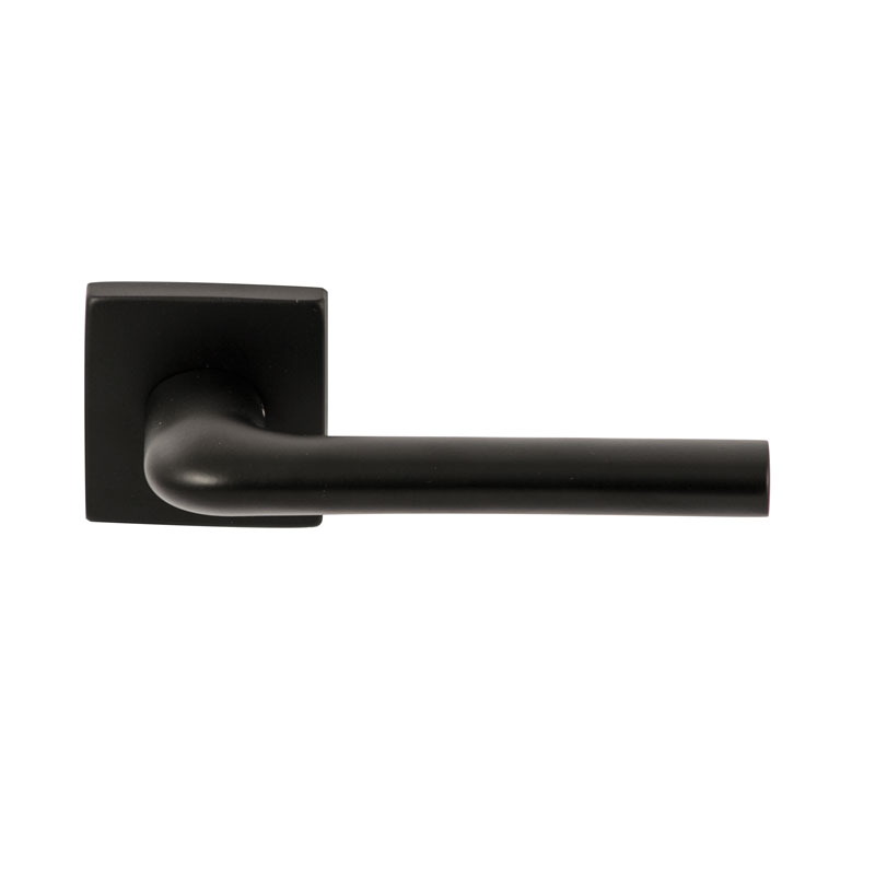 Een twintigtal moderne deurkrukken in RVS met zwarte poedercoating met geveerde rozetten, een prettige prijs en hoogwaardige kwaliteit.