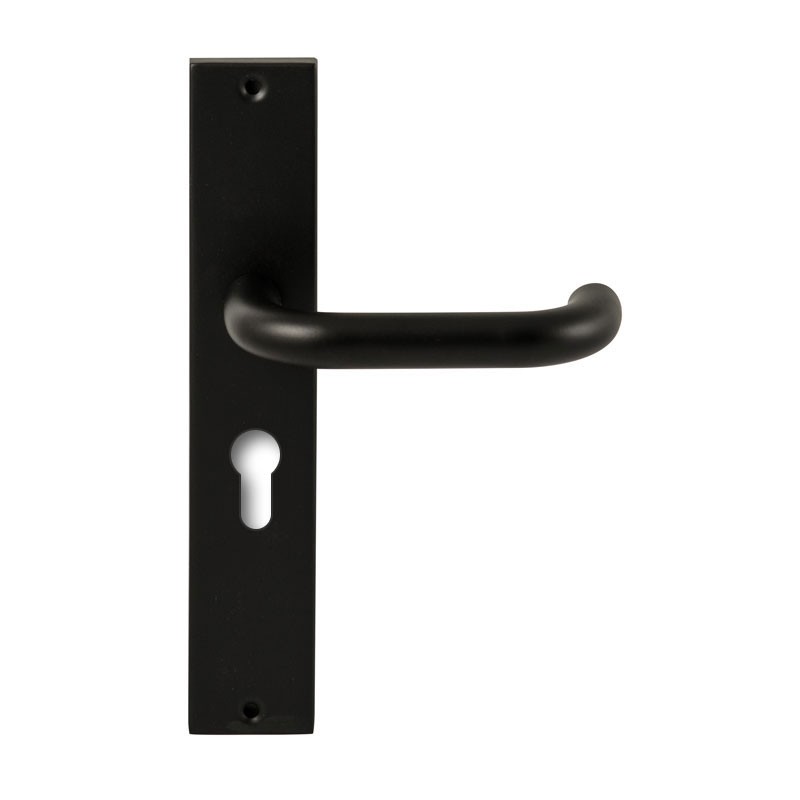 Een twintigtal moderne deurkrukken in RVS met zwarte poedercoating die vastgeveerd op een schild geleverd worden met een prettige prijs en hoogwaardige kwaliteit.