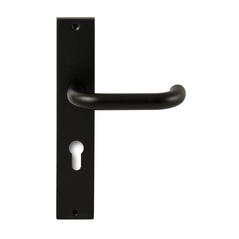 Een twintigtal moderne deurkrukken in RVS met zwarte poedercoating die vastgeveerd op een schild geleverd worden met een prettige prijs en hoogwaardige kwaliteit.