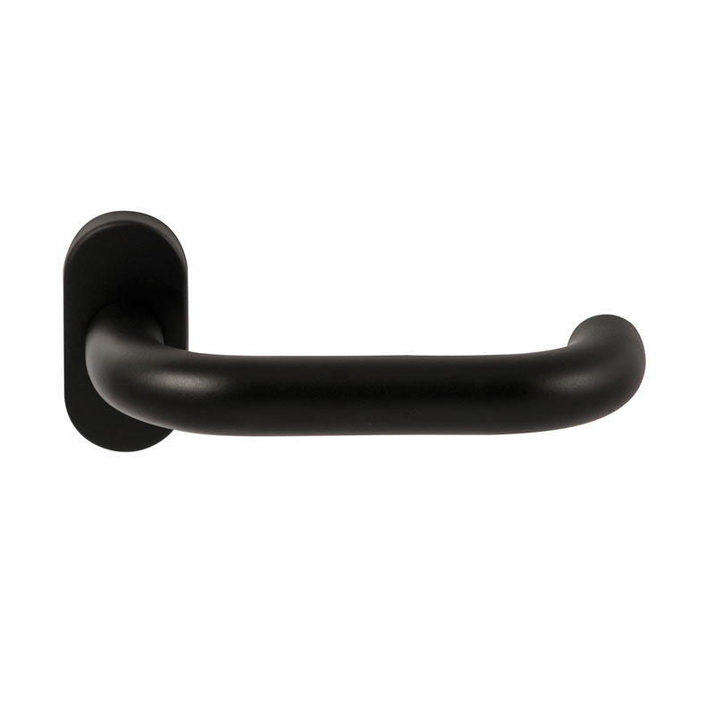 Een twintigtal moderne deurkrukken in RVS met zwarte poedercoating met geveerde rozetten, een prettige prijs en hoogwaardige kwaliteit.