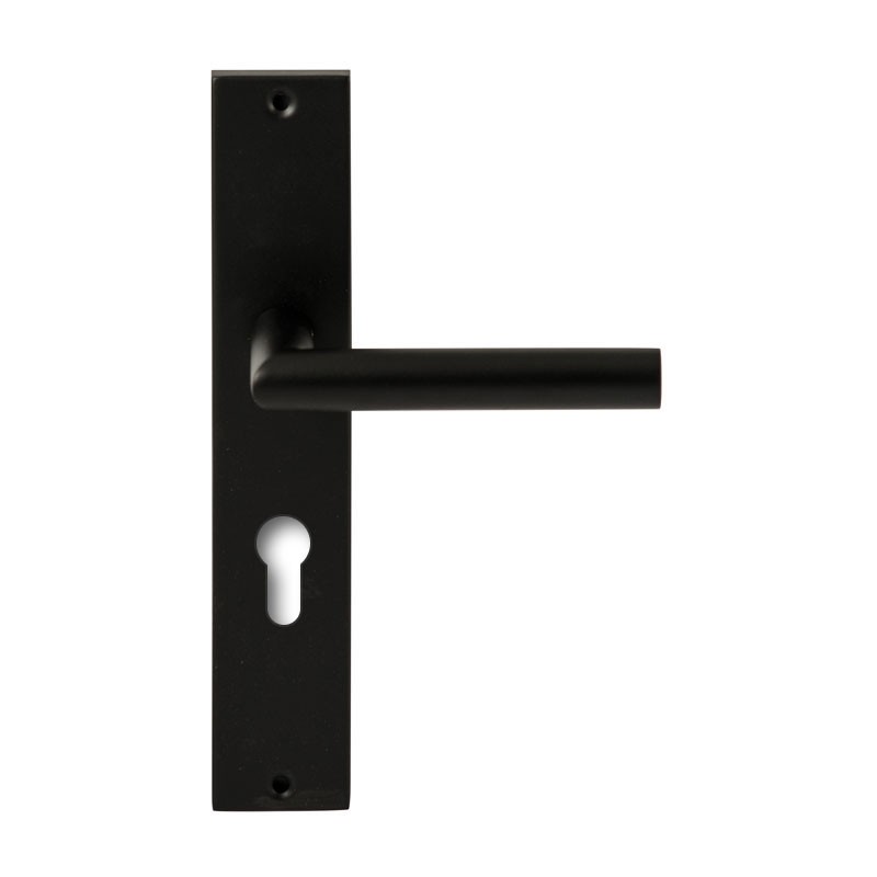 Een twintigtal moderne deurkrukken in RVS met zwarte poedercoating die vastgeveerd op een schild geleverd worden met een prettige prijs en hoogwaardige kwaliteit. Voorzien van een europrofiel uitsparing op 72mm van het krukgat.
