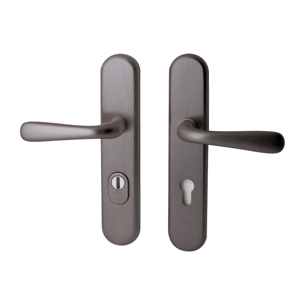 Het veiligheidsbeslag komt uit ons Mariani assortiment. De veiligheidsset is ongeveerd en uitgevoerd in PVD gun metal. Veiligheidsgarnituur Kira + Silvia pc55, vervaardigd uit messing, wordt afgewerkt met een geschuurde finish met een grafiet kleur. De deurklink is ook verkrijgbaar in diverse andere kleuren.