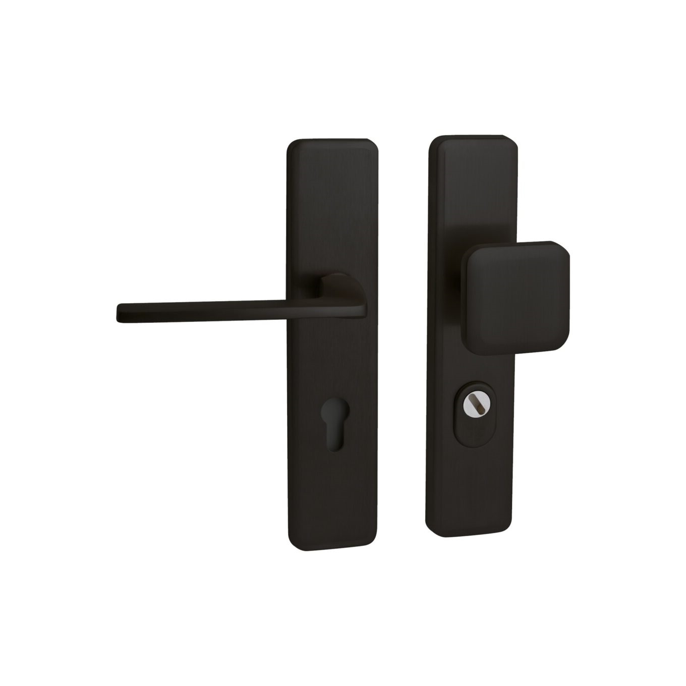 Een paar veiligheidsschilden PC92, veiligheidsknop Charley, een linkswijzende deurkruk Zenith, een wisselstift tot deurdikte 40mm & montagemateriaal tot een deurdikte van 70mm