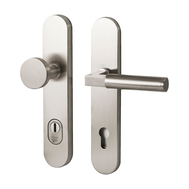 Een paar veiligheidsschilden PC72, veiligheidsknop Basel, een deurkruk Ottawa, een wisselstift tot deurdikte 40mm & montagemateriaal tot een deurdikte van 70mm