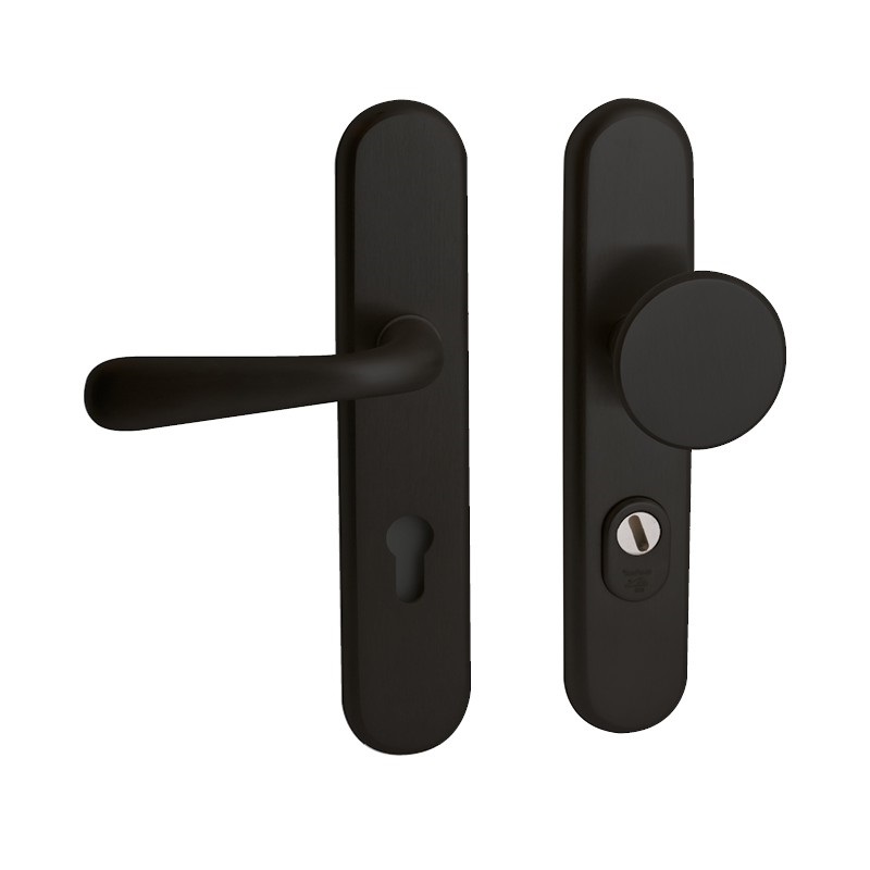 Een paar veiligheidsschilden PC72, veiligheidsknop Basel, een linkswijzende deurkruk Silvia, een wisselstift tot deurdikte 40mm & montagemateriaal tot een deurdikte van 70mm