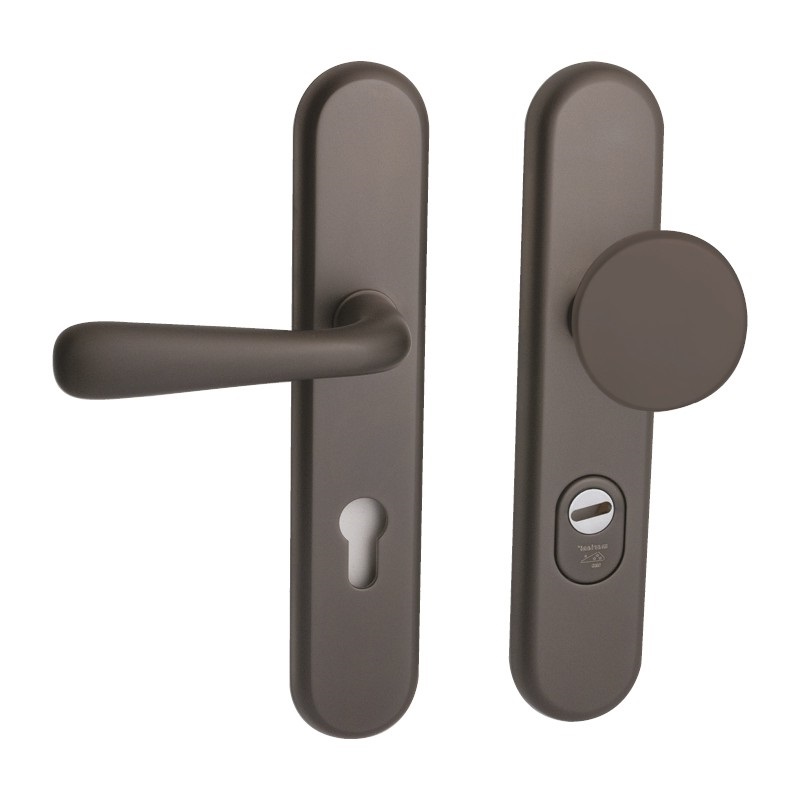 Een paar veiligheidsschilden PC92, veiligheidsknop Basel, een linkswijzende deurkruk Silvia, een wisselstift tot deurdikte 40mm & montagemateriaal tot een deurdikte van 70mm