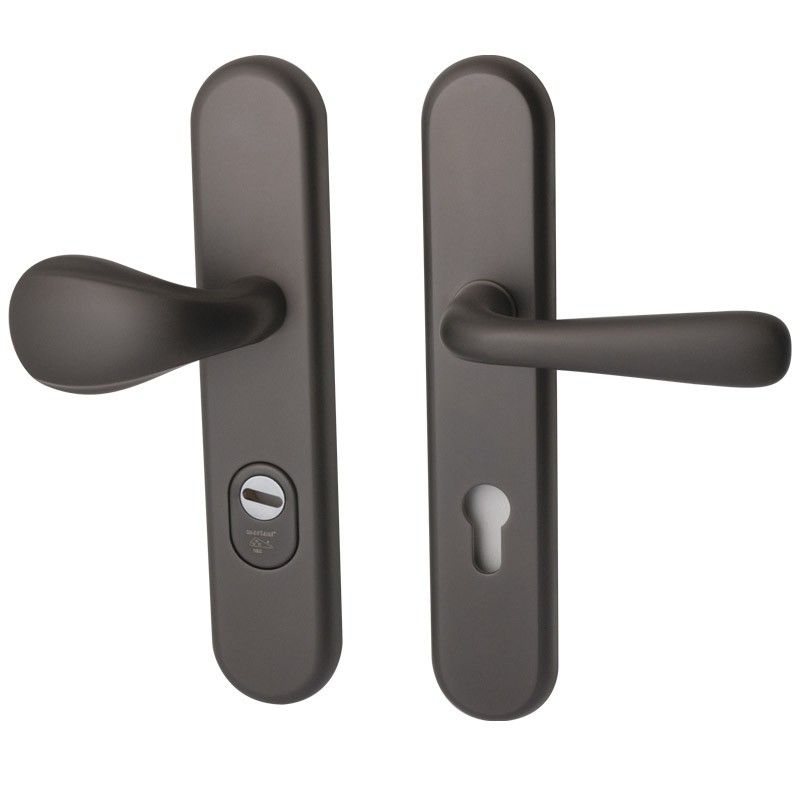 Een paar veiligheidsschilden PC55, veiligheidsknop Golf, een linkswijzende deurkruk Silvia, een wisselstift tot deurdikte 40mm & montagemateriaal tot een deurdikte van 70mm