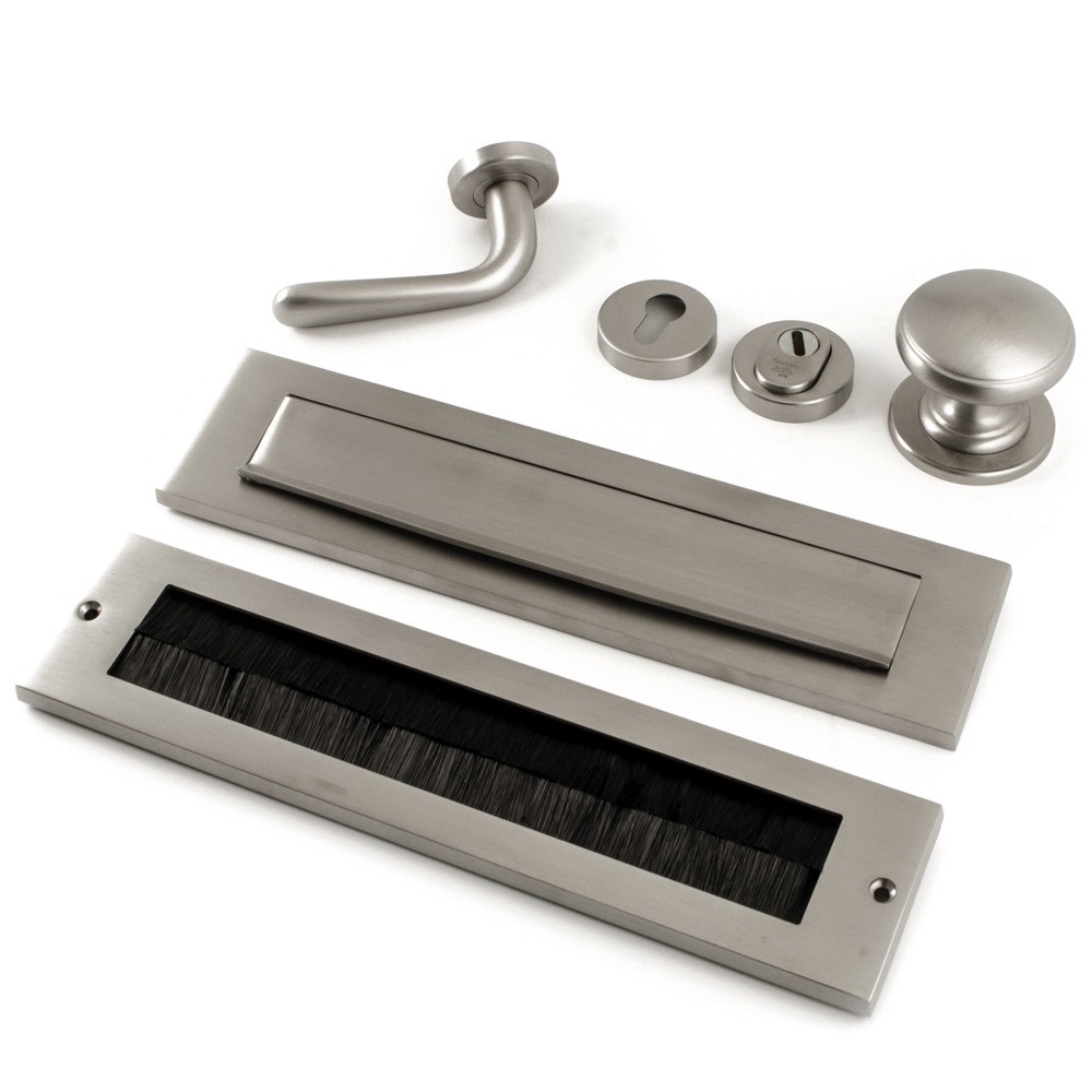 Voordeurknop, veiligheidsrozetten met SKG***, briefplaat, tochborstel en deurkruk gatdeel linkswijzend.