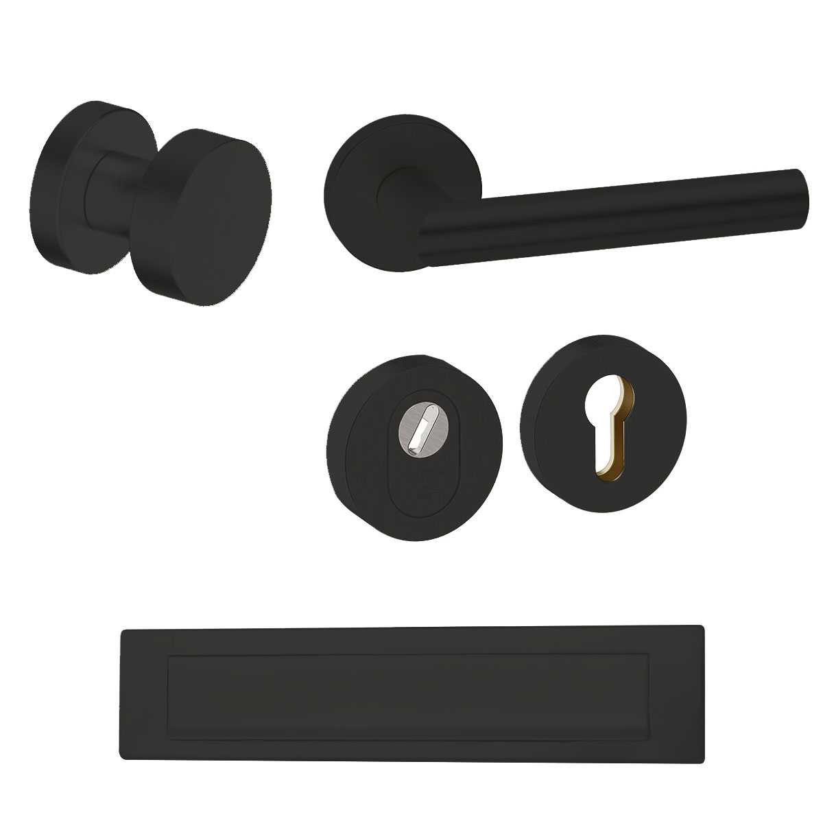De voordeurset rond met Piano & briefplaat zwart bestaat uit een blind te monteren voordeurknop, een briefplaat met klepbescherming voor minder geluid, een SKG*** gekeurd veiligheidsrozet met een anti-kerntrek blok en een haakse deurkruk voor de binnenzijde. Deze heeft een veermechanisme welke universeel voor rechts en links gebruikt kan worden.