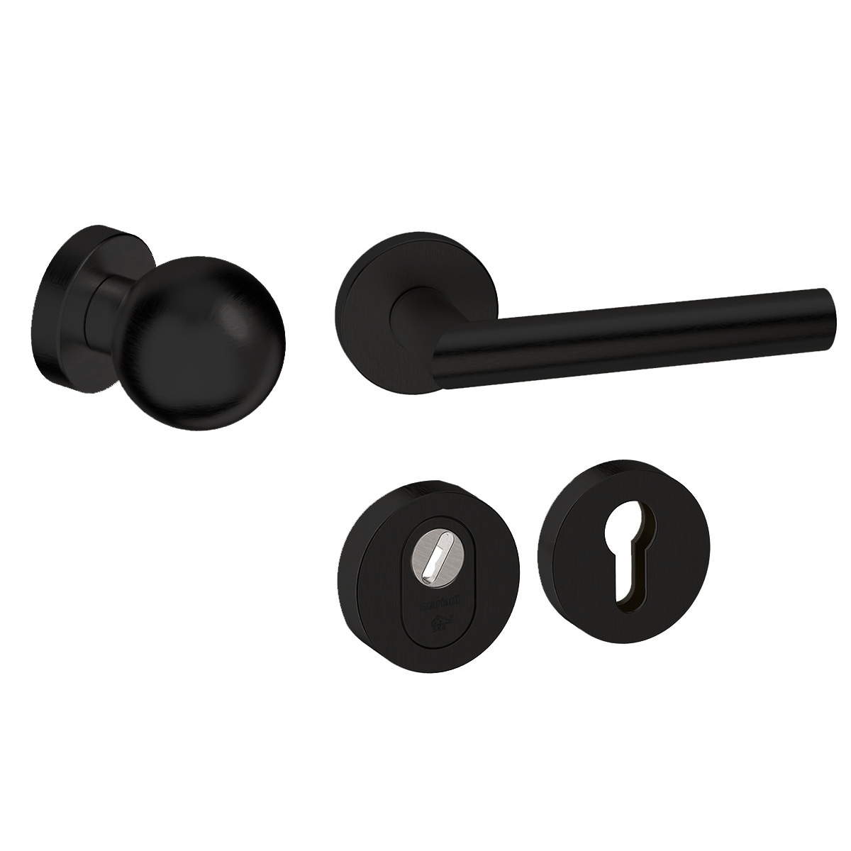 De voordeurset rond met Sfera zwart bestaat uit een blind te monteren voordeurknop, een SKG*** gekeurd veiligheidsrozet met een anti-kerntrek blok en een haakse deurkruk voor de binnenzijde. Deze heeft een veermechanisme welke universeel voor rechts en links gebruikt kan worden.
